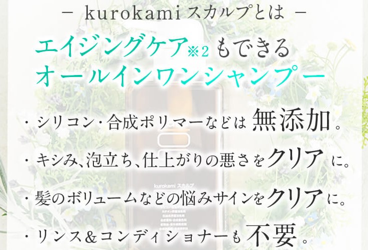 haru「kurokamiスカルプ」は100%天然由来・無添加設計で頭皮と髪にやさしく、オールインワンで扱いやすいシャンプーです。